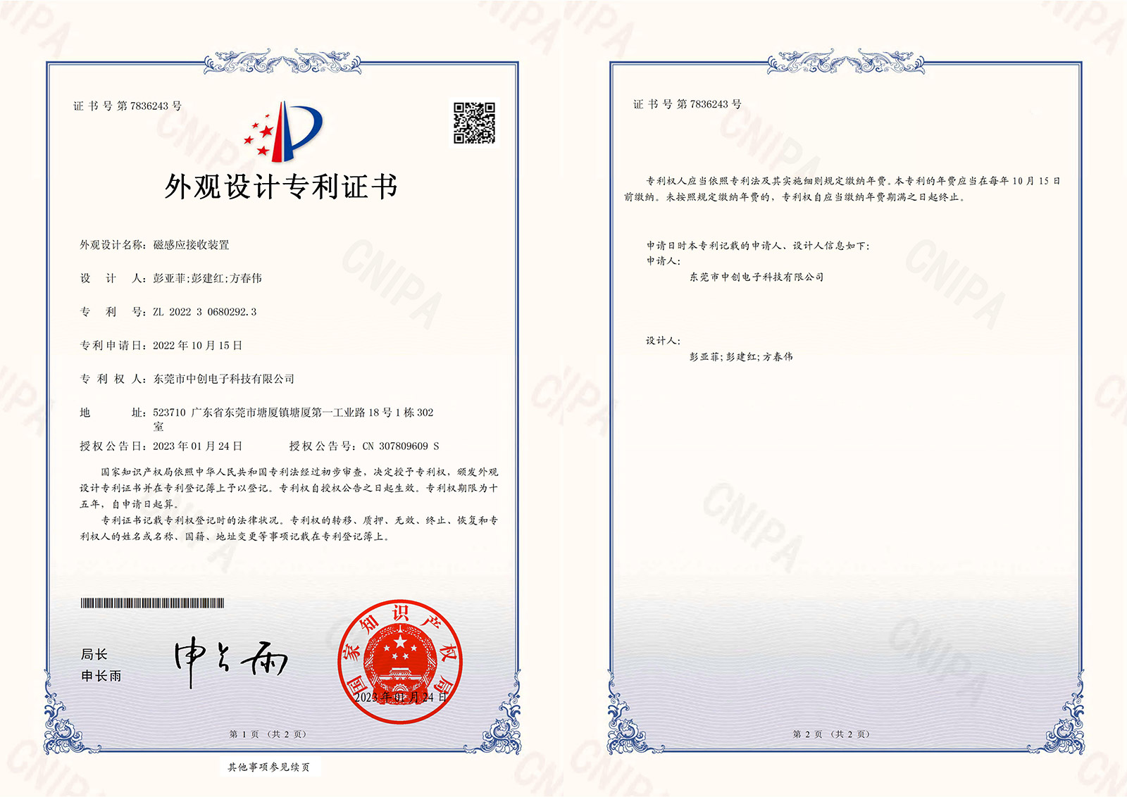 磁感應(yīng)接收裝置外觀設(shè)計(jì)專利證書